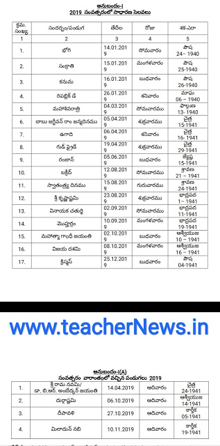 The Government of Andhra Pradesh direct that the days specified in Annexure-I shall be observed as General Holidays by all the State Government Offices excluding the holidays falling on Sundays shown in Annexure-I (A) and Optional Holidays shown in Annexure-II except the Optional Holidays falling on Sundays shown in Annexure-II(A) during the year 2019.