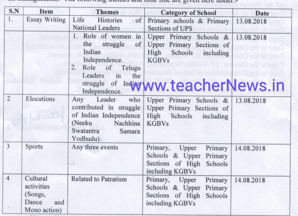 Hence all the District Project Officers, SSA and District Educational Officers in the State are informed that, to conduct the above said events in all Primary & Upper Primary Schools including KGBVs in all managements regarding the eve of the 72th Independence Day Celebrations on 15th August 2018 in Andhra Pradesh.
