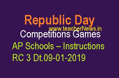 Republic Day Competitions, Games in AP Schools – Instructions RC.No.3/A & 1/2019-1 Dated: 09/01/2019 School Education – Republic Celebrations-2019 on account of Republic Day on 26-01-2019 in schools – Conduct of various competitions at school, complex, Mandal, Divisional and District Level – Instructions — Issued. AP School Education competitions have to be conducted at school, complex, mandal, divisional and district Levels in all schools on account Republic Day on 26-01-2019 and gifts awarded to the winners.