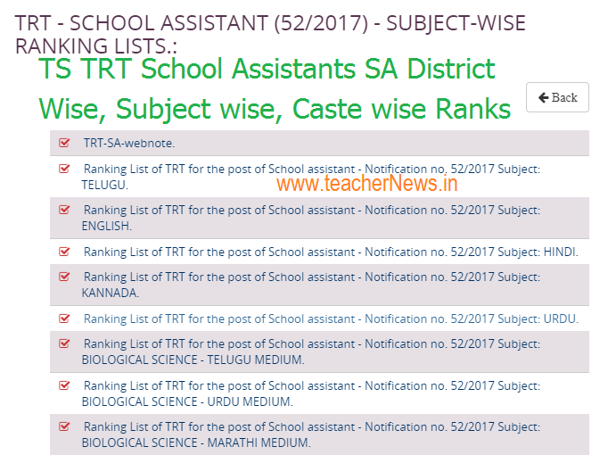 | TS TRT School Assistants SA District Wise, Subject wise, Caste wise Ranks |