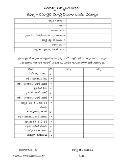 ఎవరైనా తల్లి లేదా గార్డియన్ తమ విద్యార్థి వివరాలు తప్పు గా నమోదయ్యాయి సవరించమని కోరితే వారిచే క్రింది అప్లికేషన్ పూర్తి చేయించి వెల్ఫేర్ అసిస్టెంట్ మరియు తల్లి లేదా గార్డియన్ సంతకం తో MEO ఆఫీసు లో అందజేయమని చెప్పండి.