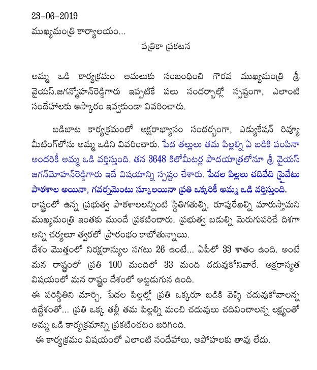 Amma Vodi Scheme Guidelines by AP Govt. Official | Amma vadi 15000 Instructions download. Amma Vodi Scheme clarity by AP Govt. Official Press Note  : CMO Office press statement on Amma Vadi scheme – అమ్మఒడి పధకంపై క్లారిటీ ఇచ్చిన ప్రభుత్వం.అమ్మఒడిపధకంపై క్లారిటీ ఇచ్చిన ప్రభుత్వం.అమ్మఒడి పధకం అమలుపై వస్తున్న సందేహాలు,అపోహలపై స్పష్టత ఇచ్చిన ప్రభుత్వం.