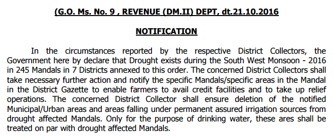 AP GO 9 Drought Affected Mandals names, Drought Affected Districts names list, Guidelines of Drought Affected list, AP Revenue Department – South West Monsoon 2016 – Khariff – Drought- Declaration of 245 Mandals as Drought Affected in the State- Orders – Issued. AP Revenue [DM.II] Department G.O.MS.No. 9 Dated: 21-10-2016. Committee have examined in detail the proposals received from the District Collectors of Srikakulam, Prakasam, SPS Nellore, Anantapuram, Chittoor, YSR Kadapa & Kurnool for declaration of Drought Affected Mandals in Khariff-2016.