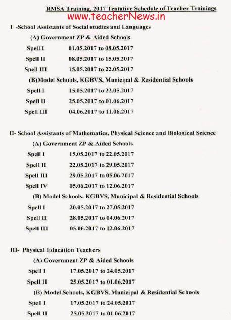 SCERT Andhra Pradesh . RMSA -Quality In-Service Teacher Training – District Level Training to Secondary School Teachers in the State – May- June 2017 – Training Schedule Issued