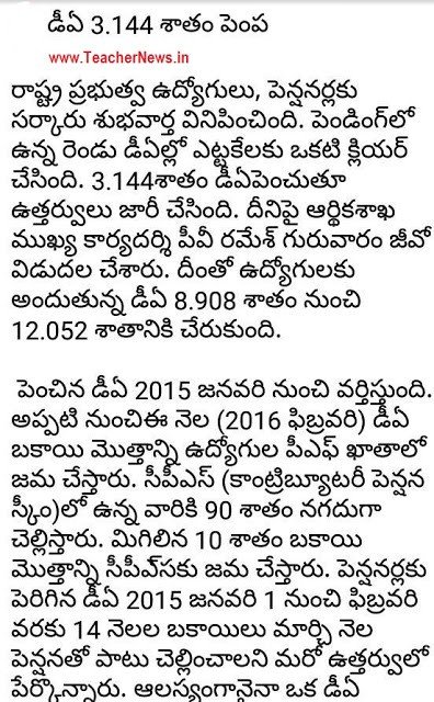 Andhra Pradesh Employees, Teachers DA Arrears from January 2015 to February 2016 will be paid to GPF accounts, Cash will be paid from March 2016.