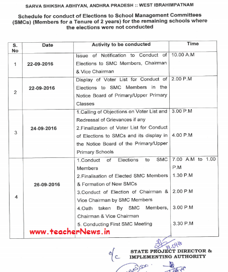 I furnish herewith the schedule to be followed as approved by the Government, Andhra Pradesh, School Education Department for the conduct of election of Chairman, Vice Chairman and members of School Management Committees for the above 506 schools in the State as mentioned in Annexure-II. I request you to issue instructions to the MEOs and HMs concerned to conduct meeting of parents/guardians to constitute SMCs on 26.09.2016 positively.