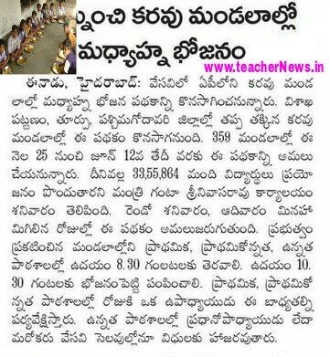 In view of the above Government have decided to provide Mid Day Meals during summer vacation 2016-17 from 24.04.2016 to 12.06.2016 (except Second Saturdays & Sundays) in drought affected mandals for Classes I-VIII & IX classes.