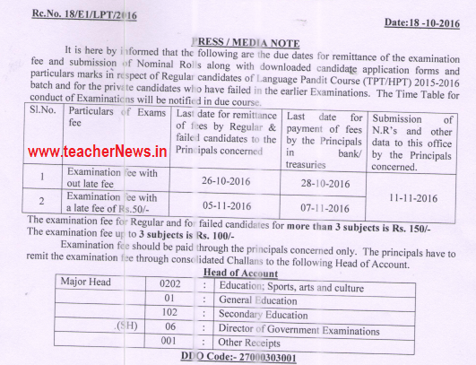 AP TPT/ HPT Exam fee last date released for 2015-16 Batch students. AP School Education has released LPT, Language Pundit Course TPT/HPT 2015-16 Batch Examination Fee Notification 2016 at www.bse.ap.gov.in. LPT Enhanced fee Particulars Download. ap lpt, language pandit course 2015-2016 batch exams fee due dates. Regular and failed candidates of Language Pandit Course (TPT/HPT) 2015-16 batch and for the private candidates.