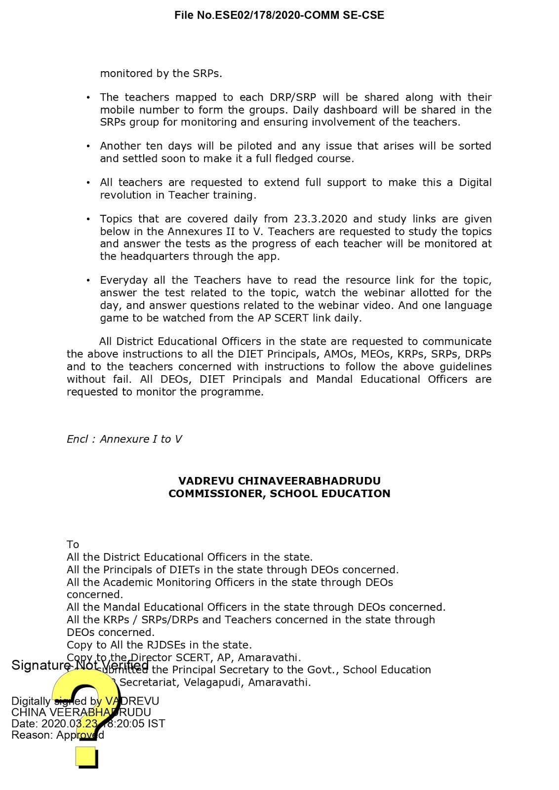 All the District Educational Officers, Principals of DIETs, Academic Monitoring Officers, Mandal Educational Officers, Key Resource Persons, State Resource Persons and District Resource Persons in the state are hereby informed that we are all aware of the Social distancing and self quarantine which is mandated at present in the wake of Covid-19.