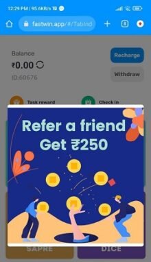 Fastwin App Refer Earn ₹250  Fastwin Refer Earn, Fastwin App Loot, Fastwin Referral Code  – This is a Fiewin substitute. In this app, you can earn up to 3 levels of referral commission by referring friends. By referring a single friend, you can earn up to $250 in referral cash when they add money and invest in the app. Fastwin App Refer Earn ₹250  If you sign up for this app, you will see many tasks to complete. Complete all of the tasks and you will receive a free bonus.