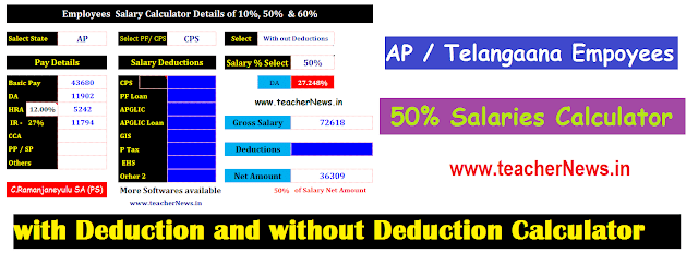 How to Know Employees 50% Salaries Calculator with Deduction, With out Deduction  : AP Teachers 50%  salary calculate sheet download. Teachers / Employees 50% with Deduction and without deduction net amount calculate software developed by C.Ramanjaneyulu. Covid-19 AP defers salaries of 50% pay for govt staff as per GO 26 (AP) and GO 27 (Telangana). The YCP government has decided to give only half of the salary to public servants in the month of March 2020. The other half will be paid once the financial situation is adjusted. The salary deferments in Andhra Pradesh were announced hours after the Telangana government took a similar decision. The Telangana government also imposed salary cuts ranging from 10 per cent to 75 per cent for its executive, political representatives and employees.