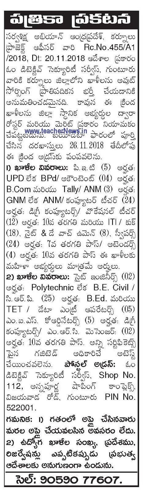 Om Detective Security Service, Shop No.112, Annapurna Shopping Complex, Vijayawada Road, Guntur.గ‌మనిక‌: వ‌రుస‌ సంఖ్య 1 నుంచి 9 వ‌ర‌కు ఉన్న పోస్టుల‌కు మ‌హిళా అభ్య‌ర్థులు మాత్ర‌మే అర్హులు.Educational