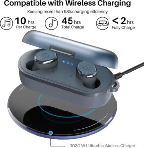 - [Charge on the go] Playtime lasts for over 10 hours from single charge and total 45 hours with charging case. Enjoy fast charging, to fully charge the rechargeable case only 1.5 hours via fast charge USB-C cable or less than 2 hours via wireless charger. Providing convenient charging way with no strings attached.