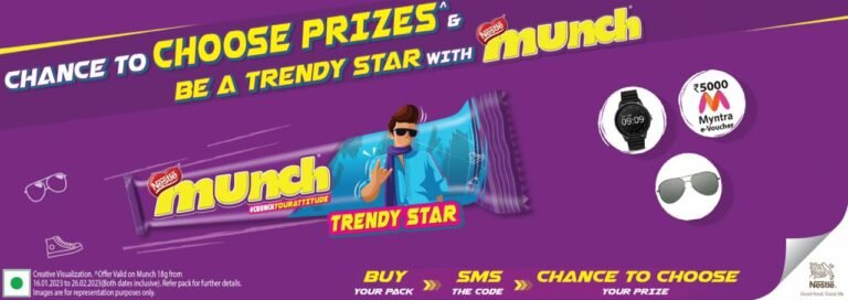 This is Munch’s second offer, known as the ‘Munch Trendy star’ offer. You only need to send a simple SMS with the LOT code to be eligible for prizes such as a smartwatch, 5000 Myntra vouchers, goggles, and so on. There will be 69 winners from across India each week, with 6 from Tamil Nadu.