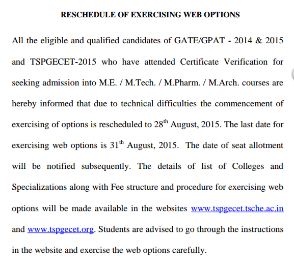 TS Telangana PGECET 2015 web Options Certificate verifications re Notification Schedule Dt. 28-08-2015 Telangana PGECET 2015 qualified candidates to attend …