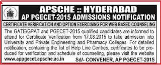 AP PGECET-2015 Certificate Verification Web Counseling Dates ME / M.Tech./ M.Pharmacy Certificate verification : 25-08-2015 (adsbygoogle = window.adsbygoogle || []).push({}); …