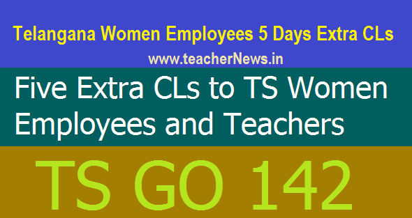 Telangana Women Employees 5 Days Extra CLs (Casual Leave) Sanctioned GO 142 : 5 Days Extra CLs (Casual Leave) to Women employees working in Telangana State. Government of Telangana Public Services –Permission to avail (5) days Casual Leave extra in addition to the Casual Leaves and Optional Holidays to all the Women employees working in the State – Orders – Issued. 5 Extra CLs to TS Women Employees /5 Days Extra CL (Casual Leave) to Women employees working in Telangana State. TS FINANCE (HRM-III) DEPARTMENT G.O.Ms.No.142, Dated: 01-09-2018. Telangana State Government has given order to extend the benefit of availing five (5) days Casual Leave extra in addition to the Casual Leaves and Optional Holidays to all the women employees working under the State Government.