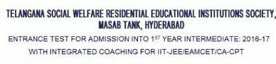 TSWREIS Entrance Test for Join Inter with IIT-JEE/EAMCET/CA/CPT Coaching 2016-17